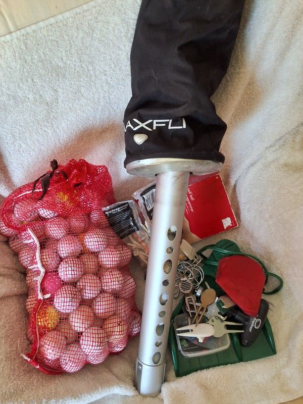 Shaggy Bag 9 Maxy fly, Bag of used balls, electric putting ball return mach., tees, shoes cleats wrench, and extras