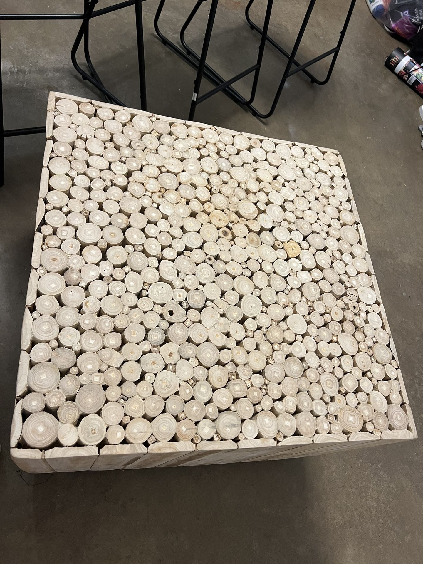 Beautiful 24” square coffee table. Has a little discoloration on top but it is raw wood so the spots could easily be sanded out and finished. Just purchased 3 months ago for $300 but does not go in our new house, my loss is your gain!! See less