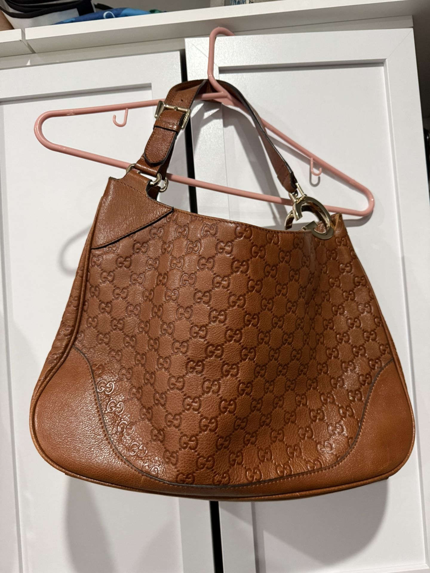 Beautiful Gucci Guccissima embossed leather shoulder bag in rich brown leather. Classic Gucci design with the signature GG embossed pattern and gold-tone hardware. Elegant everyday bag with plenty of interior space and multiple pockets. Details: •Authentic Gucci bag •Guccissima embossed leather •Gold-tone hardware •Top zip closure •Interior zip pocket and compartments •Made in Italy Good condition with normal wear from use. Leather still looks great and the bag holds its shape well. Perfect for everyday use or as a classic designer piece. Pickup in La Mirada.