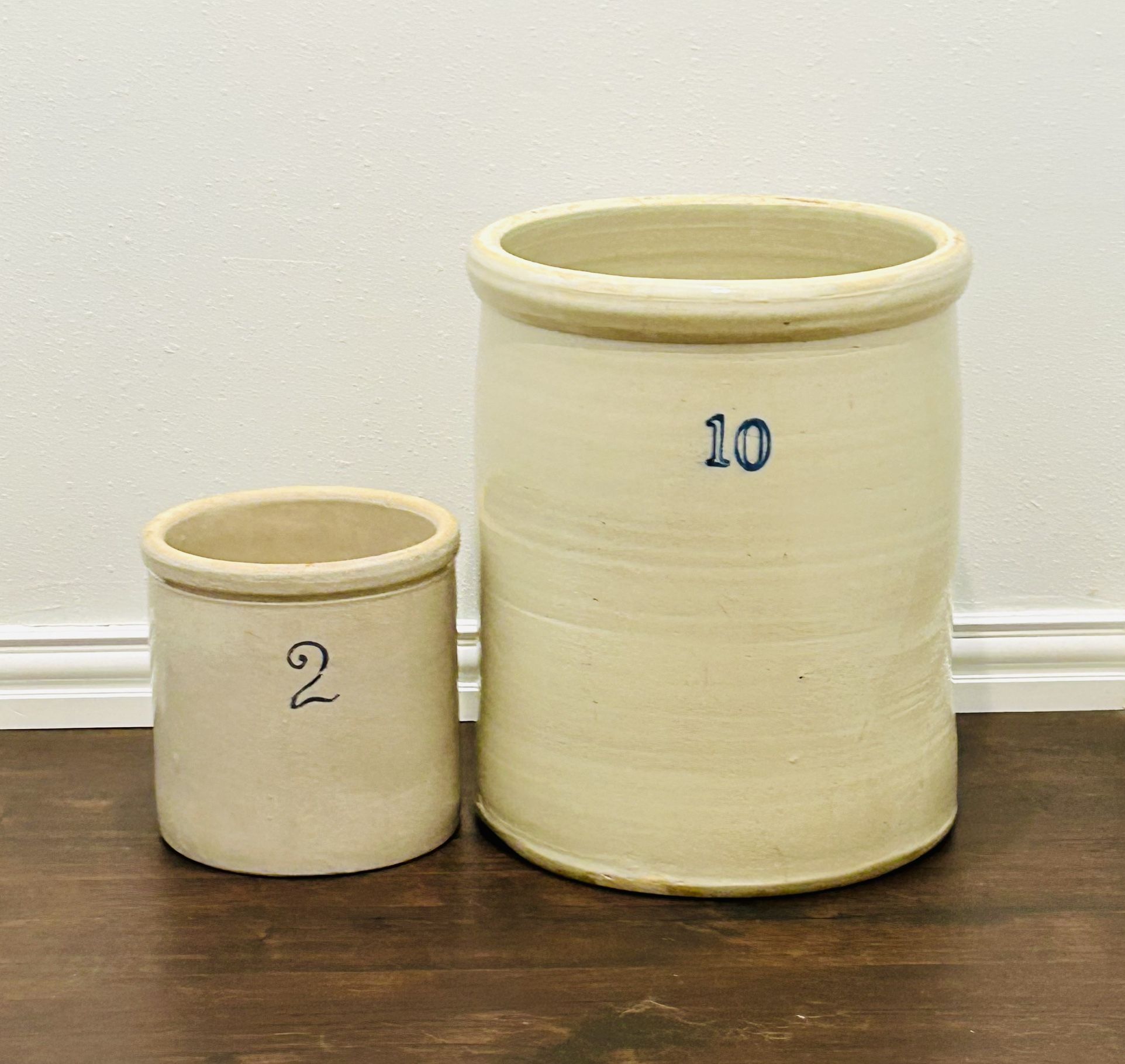 These antique crocks are both in very good condition for age and use. The 10 gallon has a minor hairline at the top and the 2 gallon has a chip at the base. See photos for details of condition. They are both tan/ beige in color with cobalt blue stamps. Great decorators pieces for any room. Dimensions are 2 Gallon is 9.5”h and 9.5” in diameter, 10 Gallon is 17.5”h x 14.5” in diameter