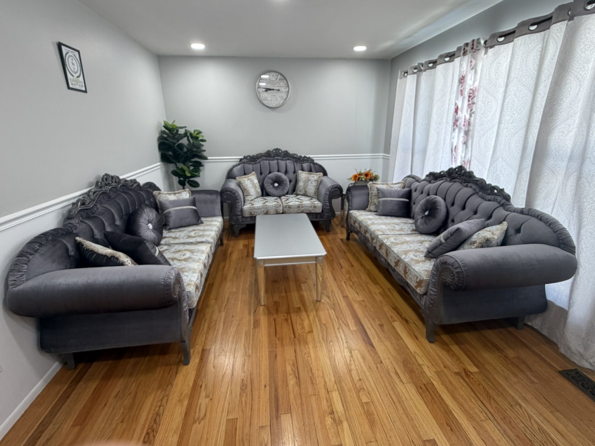 These are brand new couches we barely used. The material and cushions are bouncy and in perfect condition. Pillows included. It comes with two end tables and one coffee table.
