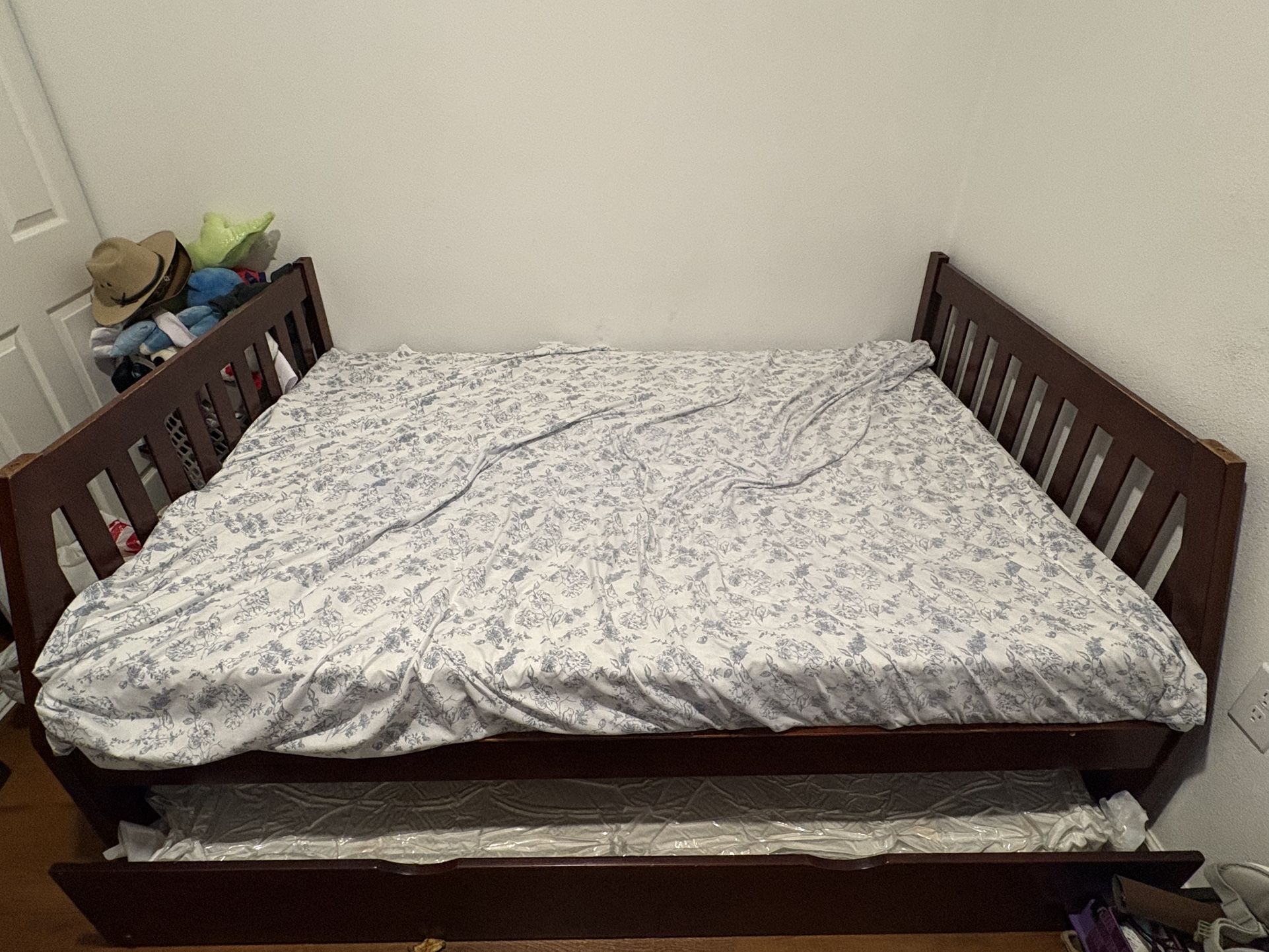 Trundle bed frame ONLY. MATTRESS NOT INCLUDED!! Top bed is Full size bottom is twin size. Dresser has a mirror $250 for both