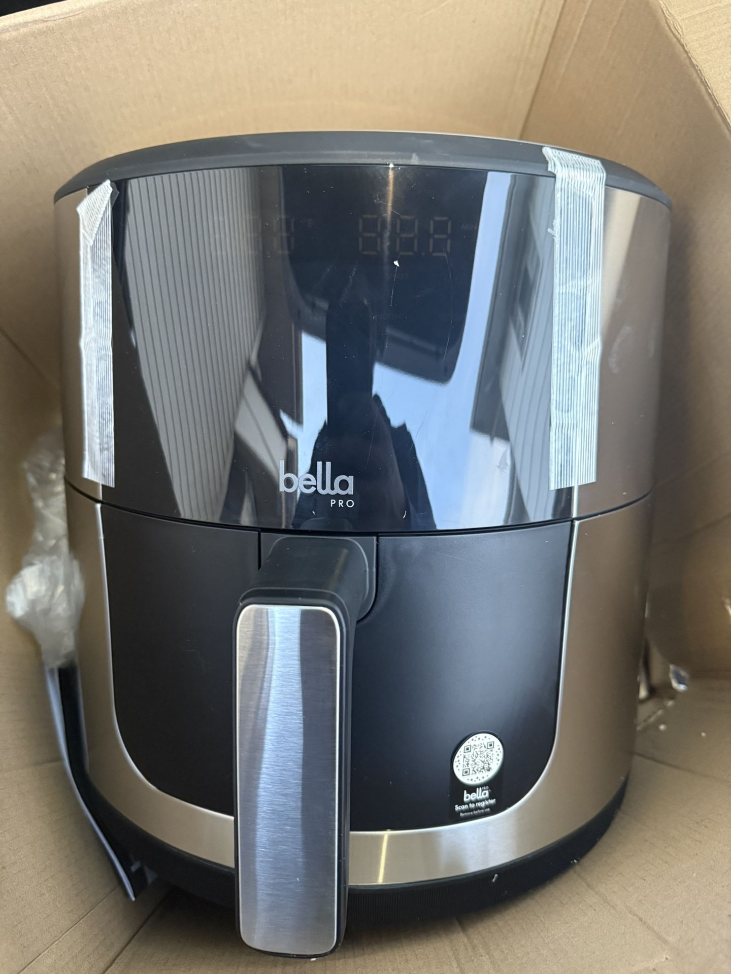 Brand new Bella Pro SmartCrisp 8-Qt Touchscreen Air Fryer, never used. Features air fry, roast, broil, bake, reheat, and dehydrate functions, plus a shake reminder for even cooking. PFOA-free, dishwasher safe, and programmable for easy use. Retails for $179. Message me if interested!