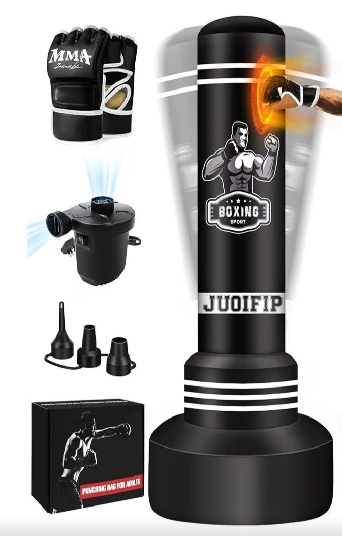 Freestanding Punching Bag for Adults, Boxing Bag with Stand Kicking Bag with Boxing Gloves and Electric Air Pump. - This punching bag with stand is made of high-quality thickened PVC, durable and elastic, which will quickly bounce back after being hit/kicked, bring you excellent boxing experience. - 27.6'' widened base make the punching bag stand more stable. Fill the base with water/sand and then inflate it using the air pump. The base weighs 180 lbs when filled with water and 200 lbs when filled with sand. You can fill it with either material or a combination of both to ensure stability. -Compare with the traditional heavy bag, inflatable punching bag for adults can be disassembled and folded when not in use, easier to move. The punching bag for teens can be used in the living room, bedroom, office and any flat ground.