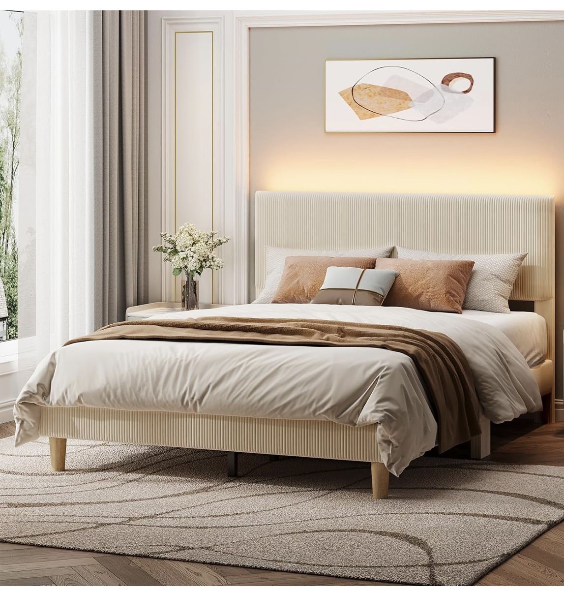 Beige corduroy queen bed frame. We are upsizing to a king and no longer need this frame. Used for maybe 2 months. LED light on headboard. Will come disassembled but all parts will be marked and placed in ziploc bags along with original assembly instructions. $100 OBO