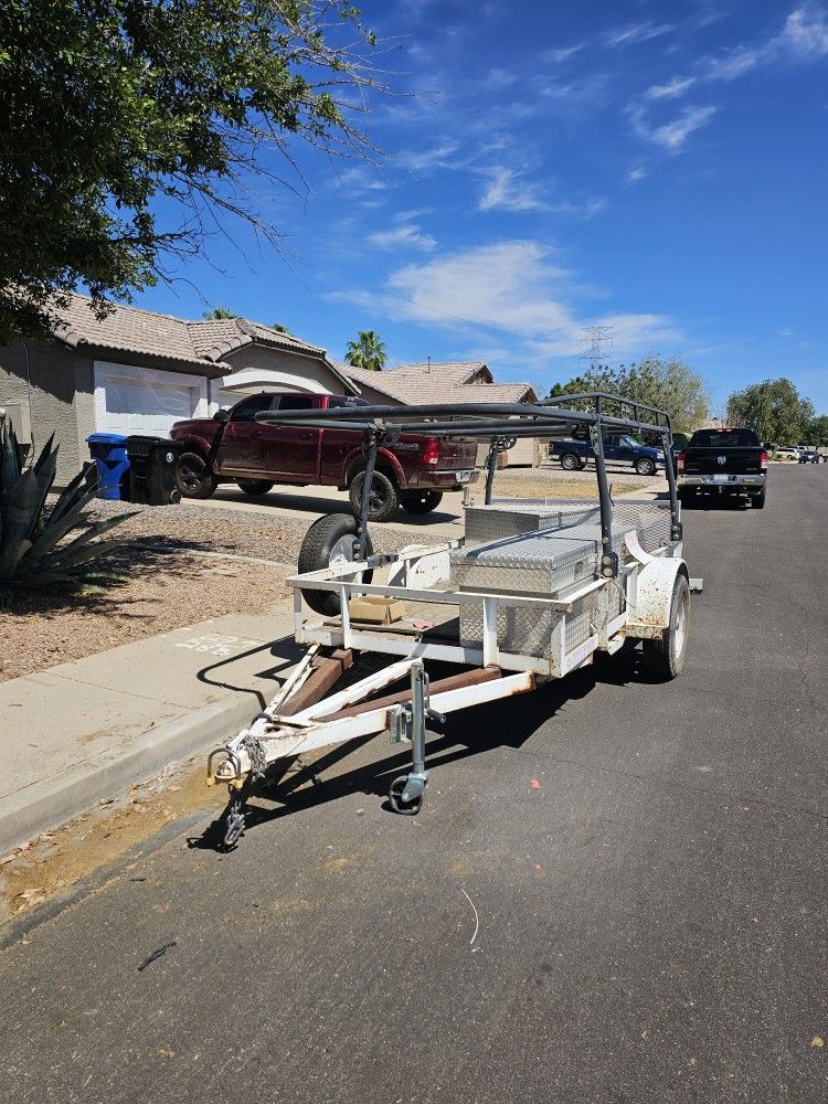 2010 Texas trailer. Has over head rack for ladders or materials. Has long removable tool box and triangle tool box for front. Measures 5.6ft X 9.6 ft. Will consider trade for enclosed trailer . Open to offers. Need to sell.