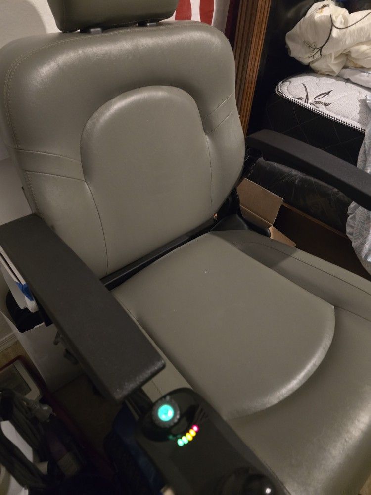 Golden Technologies power wheelchair (mid-size, joystick-controlled, padded captain’s seat)