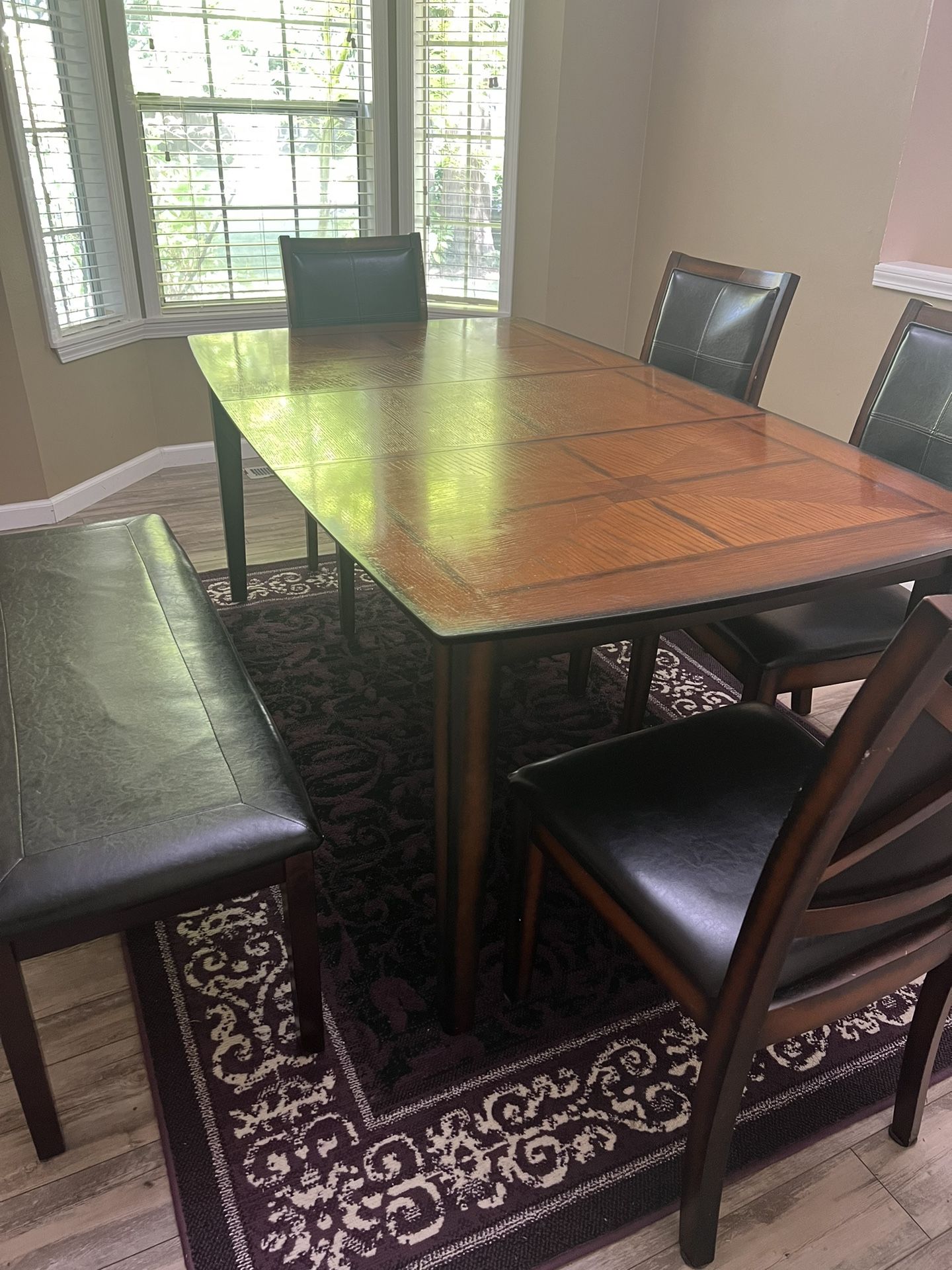 Brown dining set with table and adjustable leaf, 4 chairs and a bench. Bought 5 years ago, in perfect condition, selling $250 obo.