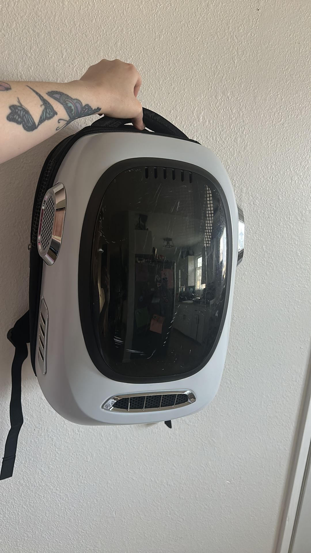 Never used my cat was too scared of it. Has fans and vents inside that hold a charge viaUSB plug in charging. Small scratch on front lens. Has UV protected lense on front.
