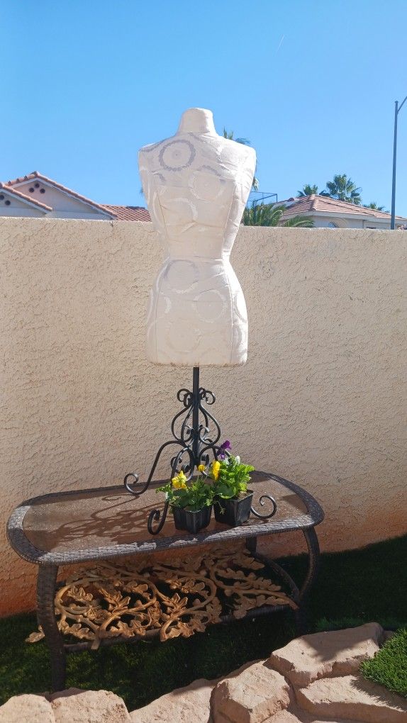 Mannequin body with wrought iron stand has a zipper beautiful soft ivory color with champagne imprints in like new condition the wrought iron piece is just an extra throwing it in with the body.