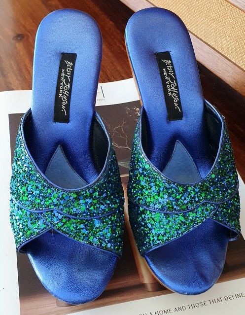 💙💚Electric Cobalt Blue/Emerald Green Glitter Slide Sandals – A rich and deep emerald green glitter with the same glamorous crossover strap, open-toe style, and comfortable fit. Pre-loved with light signs of wear, but still a showstopper. 💙Turquoise Glitter Slide Sandals – A striking oceanic turquoise glitter design with a luxe shimmer, featuring the signature crisscross strap and open-toe shape. Pre-loved with slight wear, but the color pops beautifully. 💎Betsey Johnson glitter and metallic heels, size 8, originally retailing between $200-$250, now available for just $40 each a total steal for this much sparkle or text me your best offer!