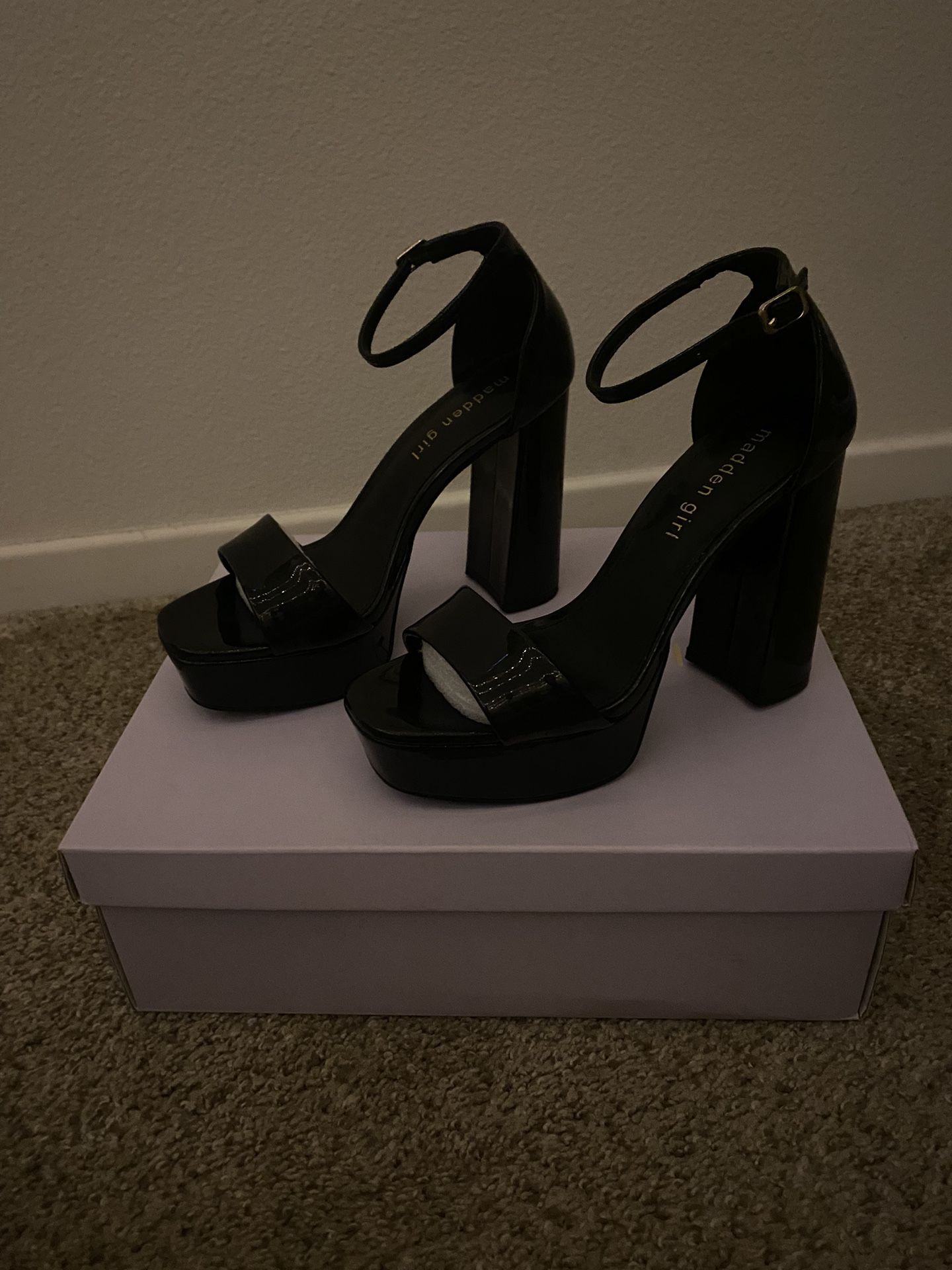 Madden girl platform black heels, never worn, box included SIZE:6.5 may run a little narrow on strap I’d say heel is around 4in and platform is 1-2in