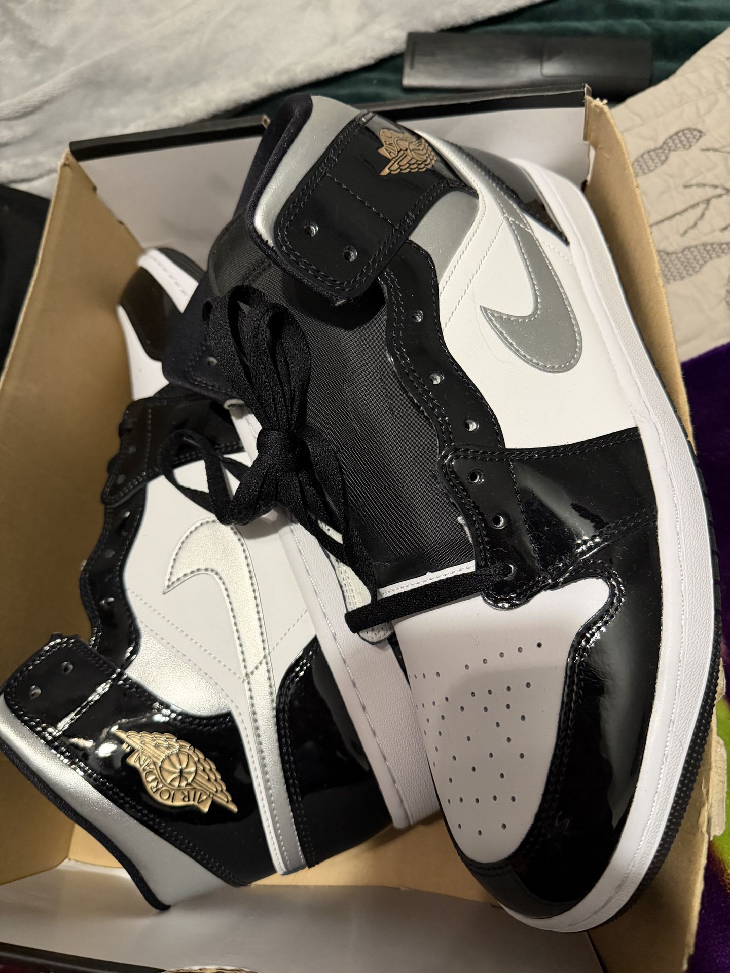 Air Jordan 1 Mid Black White Metallic Silver (black patent leather with white panels and a silver swoosh).