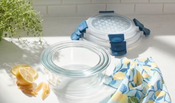 Keep food fresh in your fridge or freezer with our leak-proof storage containers with locking lids. Made of borosilicate glass, these versatile containers can also be used to cook, reheat, and transport food. Beautiful, modern BPA-free plastic lids with an exclusive embossed design feature locking tabs and removable silicone gaskets to ensure a secure fit and lock in freshness. Lids also feature a notch to easily remove and replace gaskets for thorough cleaning. Containers nest for streamlined storage for an organized kitchen. Round containers set includes 3 sizes, perfect for everyday use. • Small size: 2.5 cup. 2"H. 5"D. • Medium size: 4 cup. 2 1/4"H. 6"D. • Large size: 5.5 cup. 2 1/2"H. 6 3/4"D.