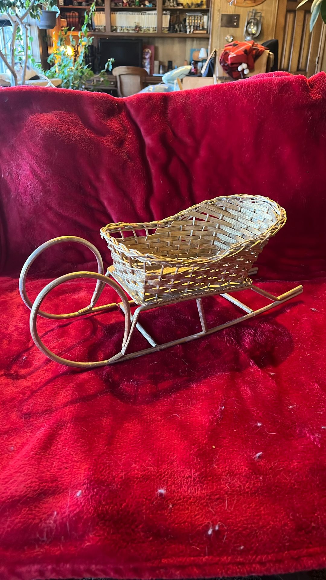 Gold wicker sleigh, great for Christmas!