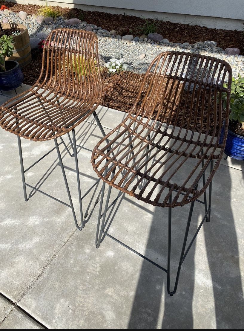 Set of 2 rattan and metal barstools. Purchased from World Market $150 each and now selling $95 each. As you can see one of the barstools has a small wooden part missing which does not affect its function. 44 in tall 32 in to seat 19 in wide at the base 18.5 in wide seat