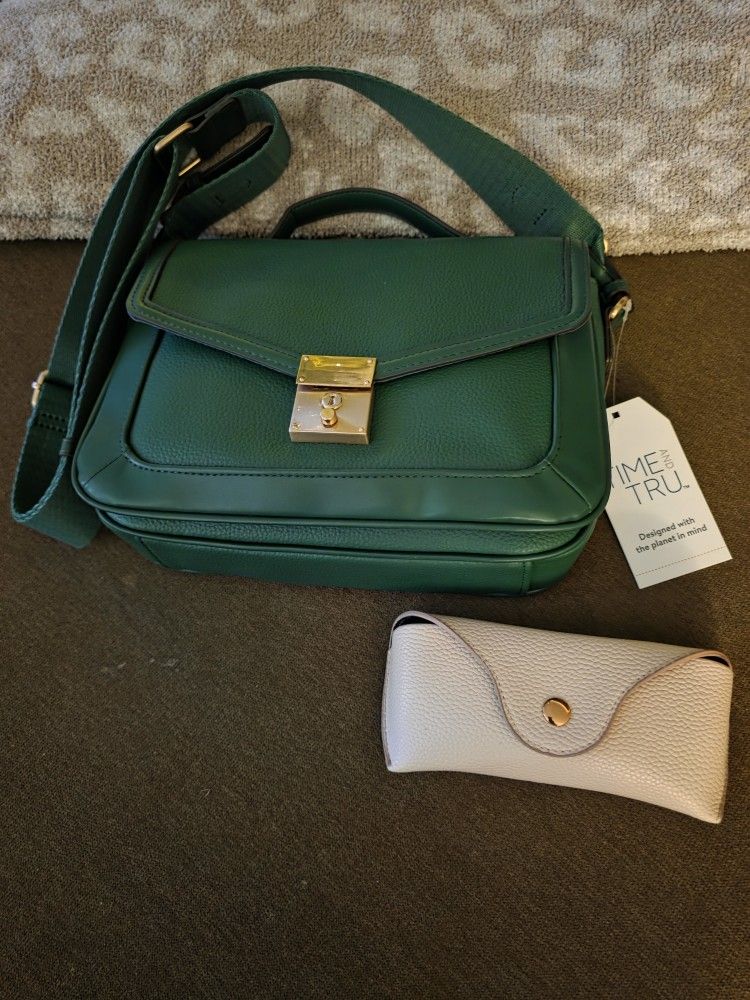 Time and Tru crossbody handbag green faux leather with gold hardware and green adjustable strap, push to lock closure. 2 inside compartments with 2 inside pockets (1 slip pocket and 1 zippered pocket), 1 exterior snap close pocket on back. Eyewear case is shown to give visual on sizing - case does not come with bag.
