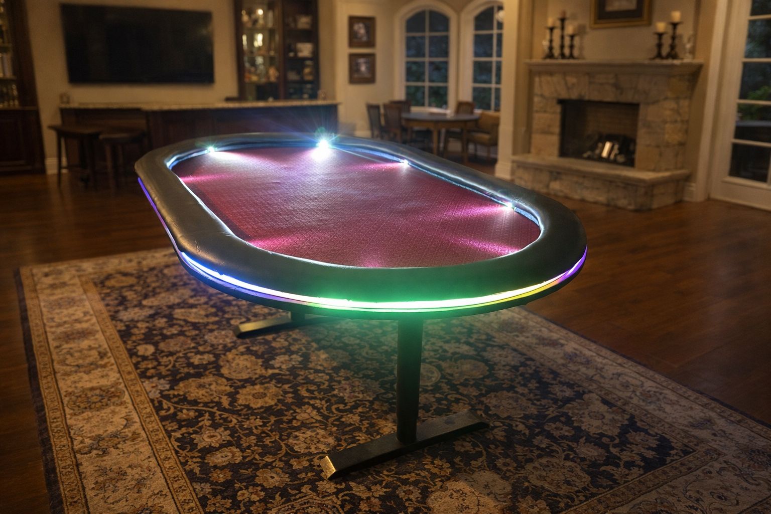 For sale is my custom poker table with card spot lights and an outer LED ring with a remote It has two cords that need to be plugged in for the lights to work Stand is removable for easier transport Thank you for your consideration $500 obo Delivery extra