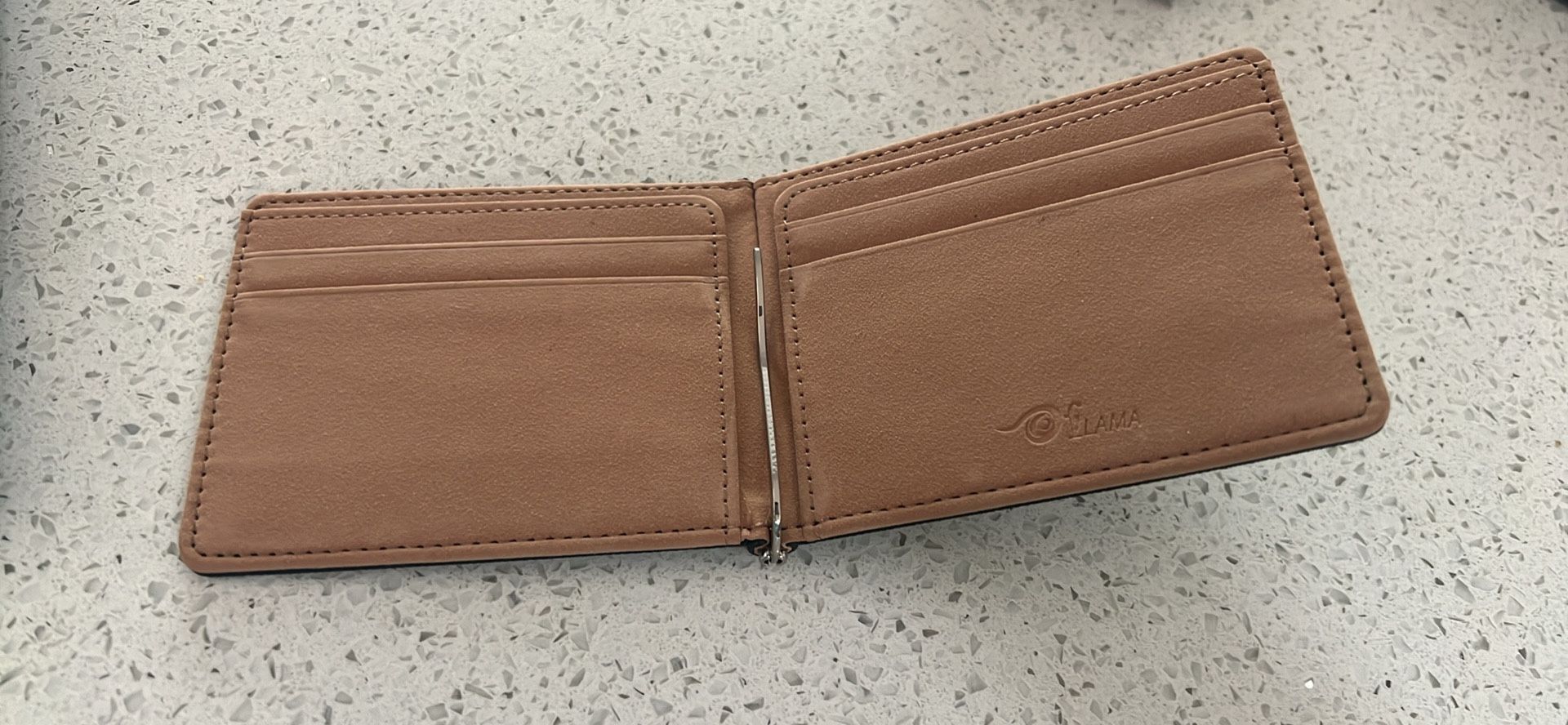 Credit card and cash clip wallet. Can be used for both type of genders men and women. Man made leather.