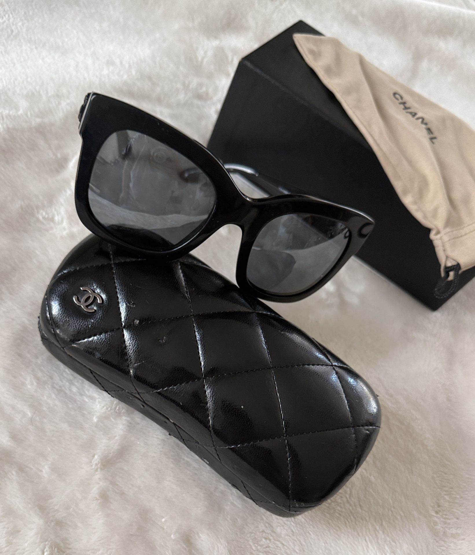 Sleek and stylish CHANEL sunglasses. Glossy black frame with iconic design. Perfect for a sophisticated look. Very classy. There’s minor scratch and scuff on the right lens but hardly noticeable when wearing. The black case has peelings. These come with box, hard case, authenticity card, booklet and dust bag