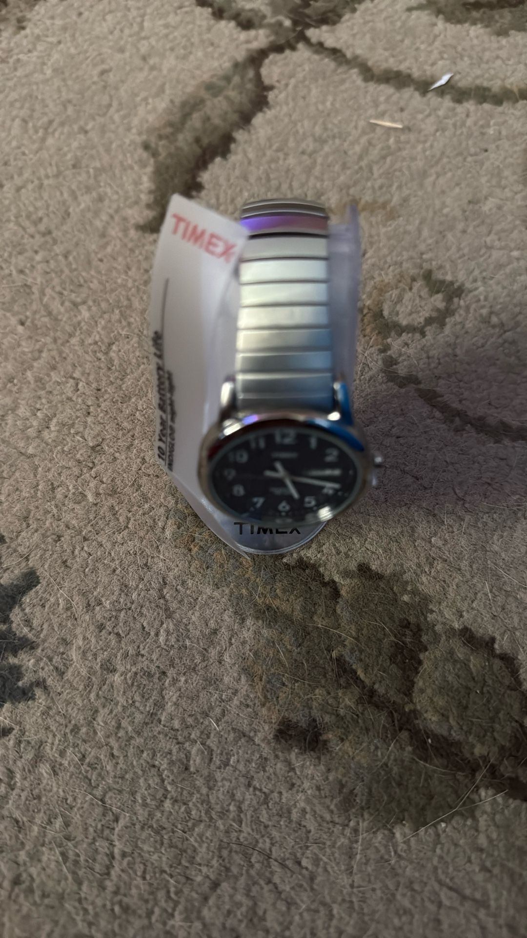 You’re looking at a man’s watch, Black face, silver band, 10 year battery life, indiglo night-light. Box is in bad shape, watch still new as you can see from pictures. Bought for Dad but he passed.
