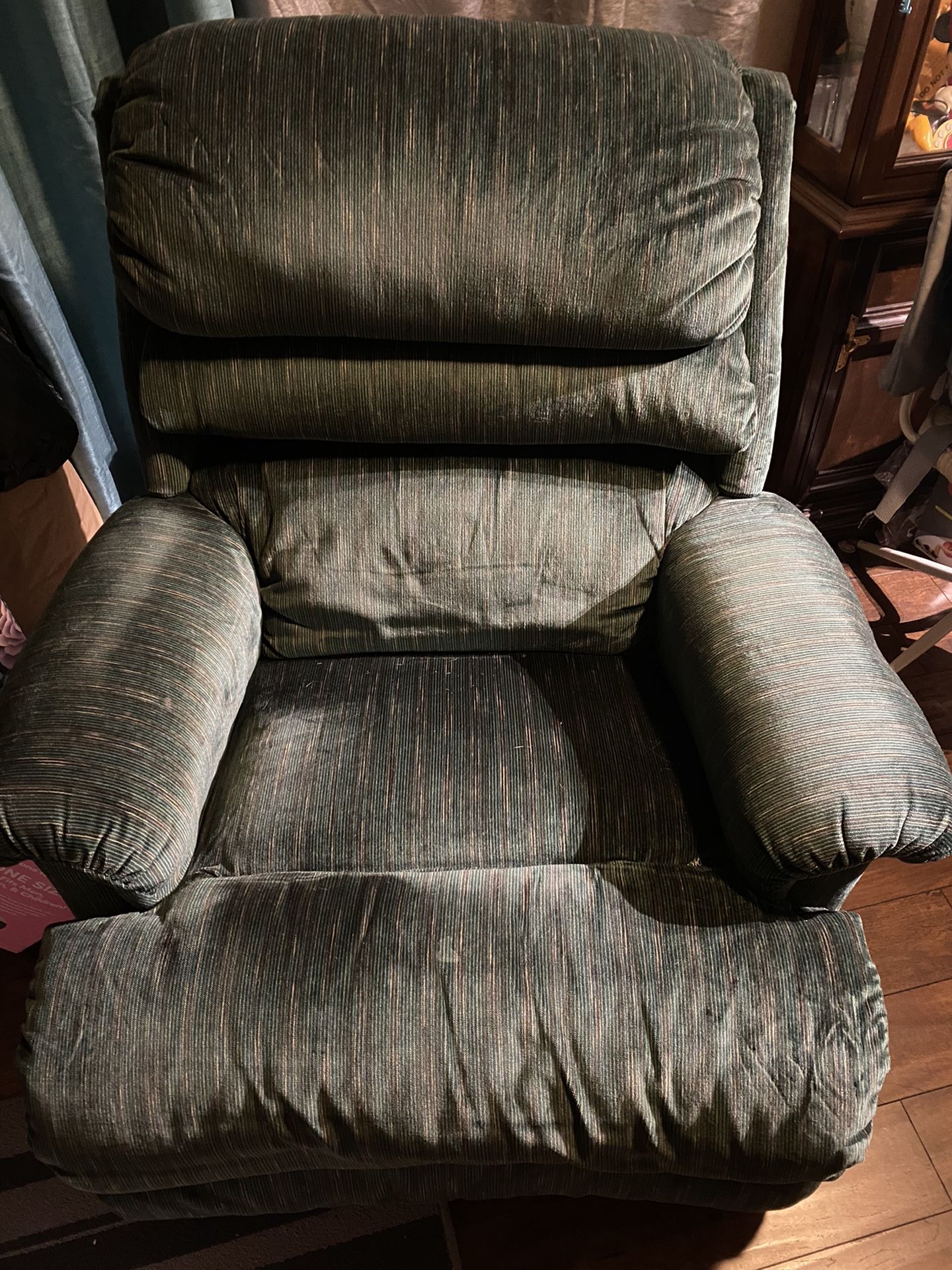 This chair has been well well taken care of. It’s green, soft to the touch and extends all the way back. It can be used to sleep in. Very comfortable. Plus it can be used as a rocking chair.