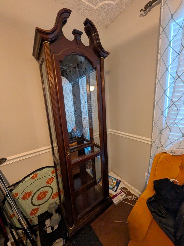 This is an antique china cabinet with an ornate top, mirrored backing and glass shelves(not pictured). The shelves are wrapped up so they wouldn't get damaged. Excellent condition. I'm selling it for my uncle in West Ashley. Delivery is available for an additional fee. It's also from a smoke free home. Please do not ask if it's still available. If I sell it, the post will be marked as such. Thank you π