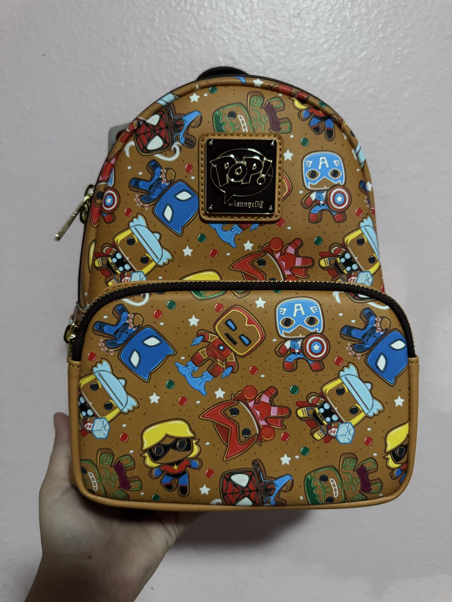 POP Marvel Avengers mini backpack. Includes Captain America, Scarlet Witch, Captain Marvel, Spiderman, Thor, Hulk, Black Panther, & Iron Man as gingerbread cookies. Brand new with tags