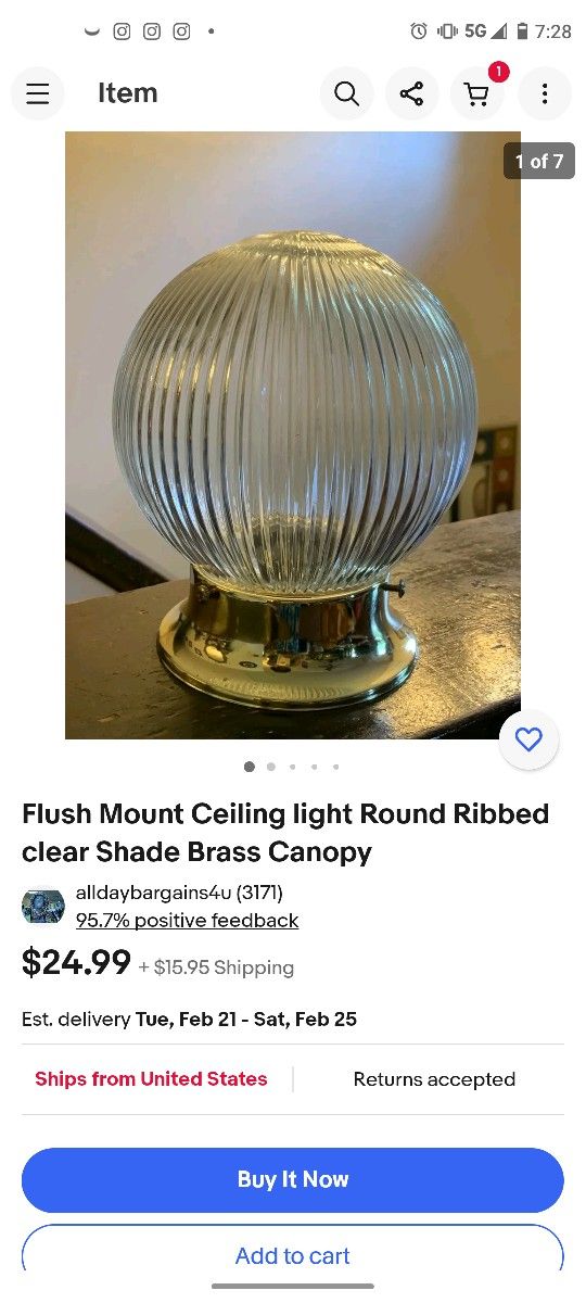 Flush Mount Ceiling light Round Ribbed clear Shade Brass Canopy Same one on eBay is over 40. I'm selling three for 30.