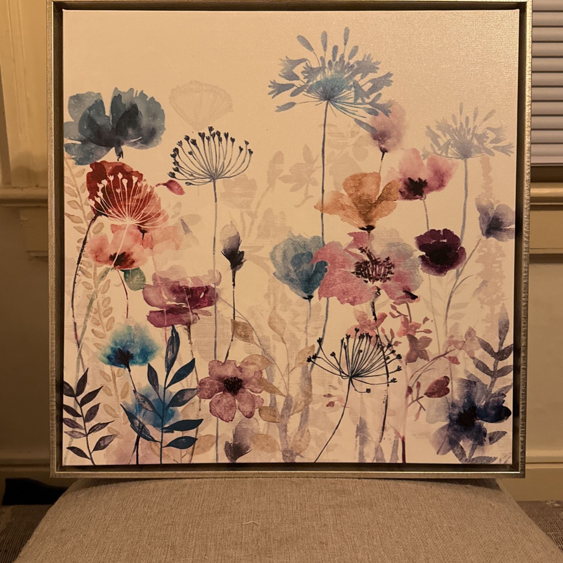Beautiful teal, purple, rose and maroon flowers. White canvas w/ brown/gold frames 17x17