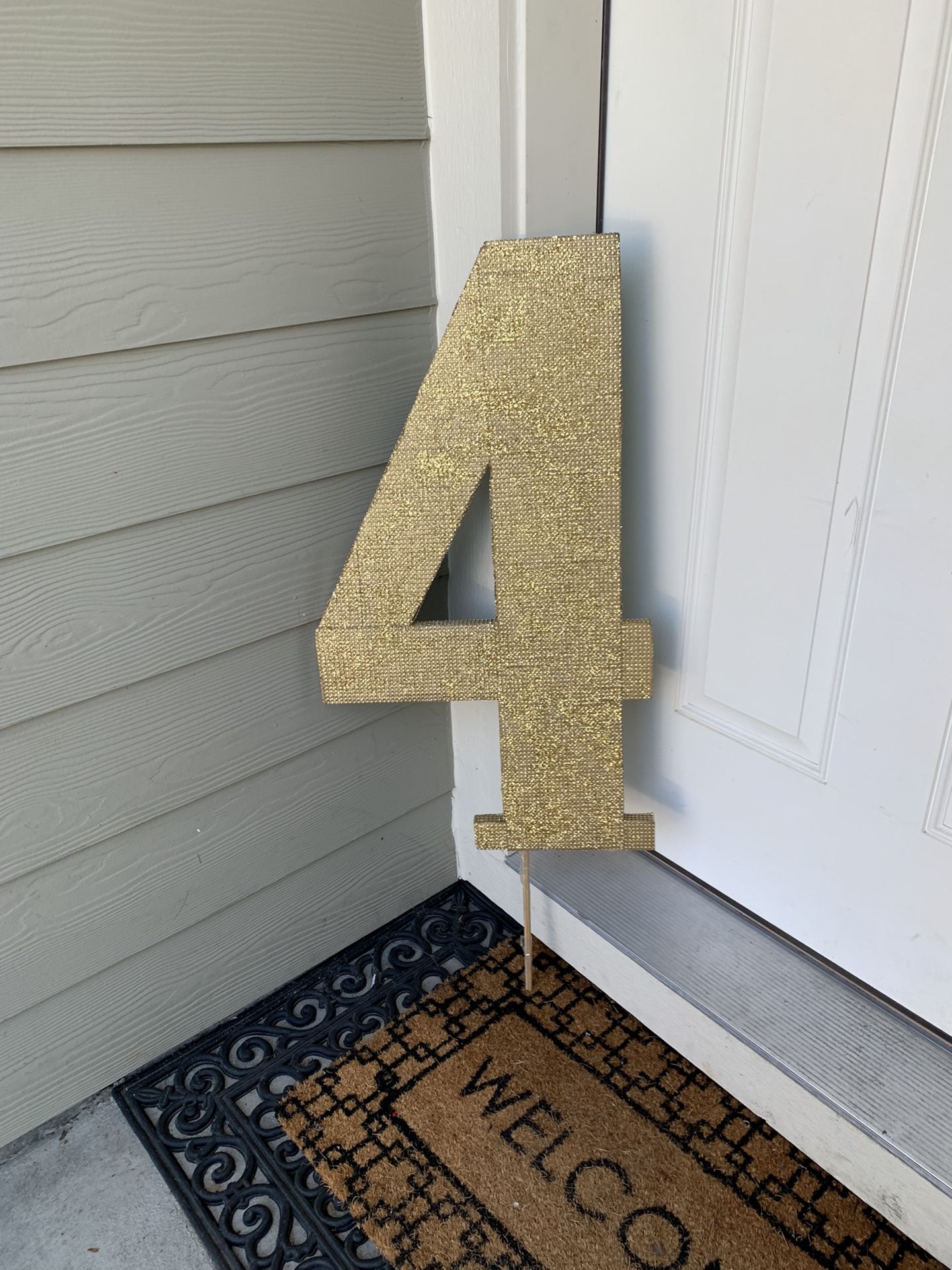 Number 4 , made from foam 30 inches H 16 inches W Gold