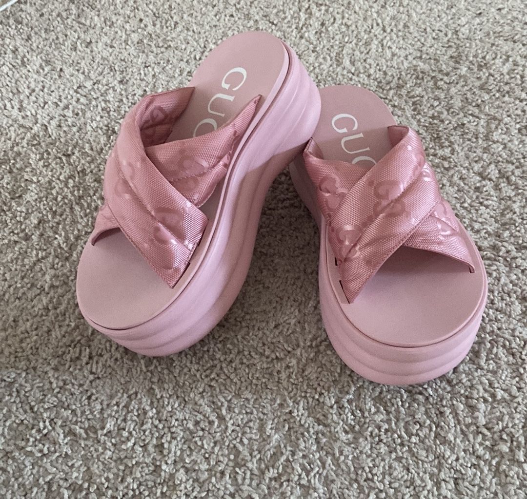 Authentic gucci shoes. New in box. Linen Dust bag, warranty card and shoebox are included in this listing. Very fun and pink. True to size 7 medium width to 7.5. Made in Italy. Easy to walk. Comfortable on top of the foot. Don’t be afraid. It’s really pretty and fun. Heels 2.5”. Width 4.5”. Retail $970
