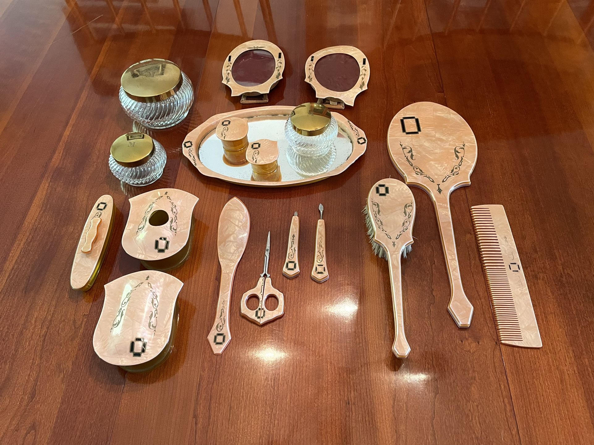 26 piece boudoir / dressing table vanity set. Color is antiqued pink with gold and black decoration. There is a monogram M on the lids of the glass jars. Defects: wear on some of the black and gold decorations, some desilvering on the tray, one portrait holder is missing its plastic sleeve.