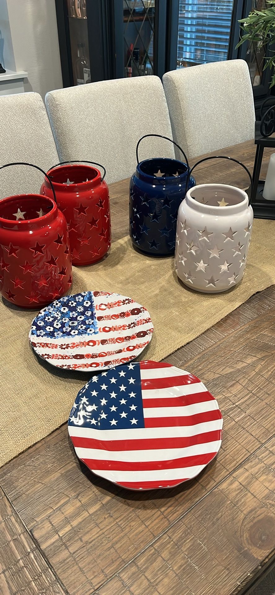 4 ceramic star indoor/outdoor lanterns. 2 red, 1 white, 1 blue. Red and white can be used for Christmas as well. Also 4 plates, 2 patterns. All in like new condition Lanterns $10 ea. plates $5 each.