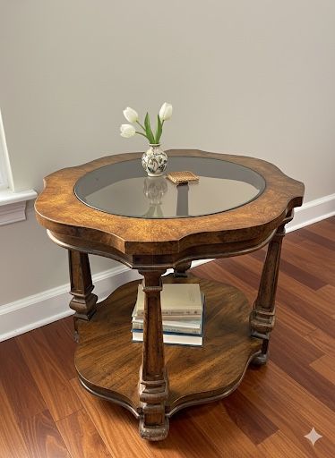 π« Elegant Round End Table / Accent Table with Glass Top β This is a beautiful and elegant round accent table or end table with a rich wood finish and a sophisticated design. It features a scalloped edge and a clear glass insert top, perfect for placing lamps, drinks, or decor. The sturdy column legs and lower storage shelf make it both beautiful and functional. It's a gorgeous piece for any living room or entryway! * Listing Price: $120 (Cash Only) * Style: Traditional / Classic * Features: Round Shape, Glass Top, Lower Shelf, Fluted Column Legs * Color: Warm Brown Wood * Condition: Excellent Used * Location: Pick up next to San Jose Airport (SJC area). * Policy: First come, first served. Please be ready to pick up promptly. No holds. Add this classic accent table to your home today!
