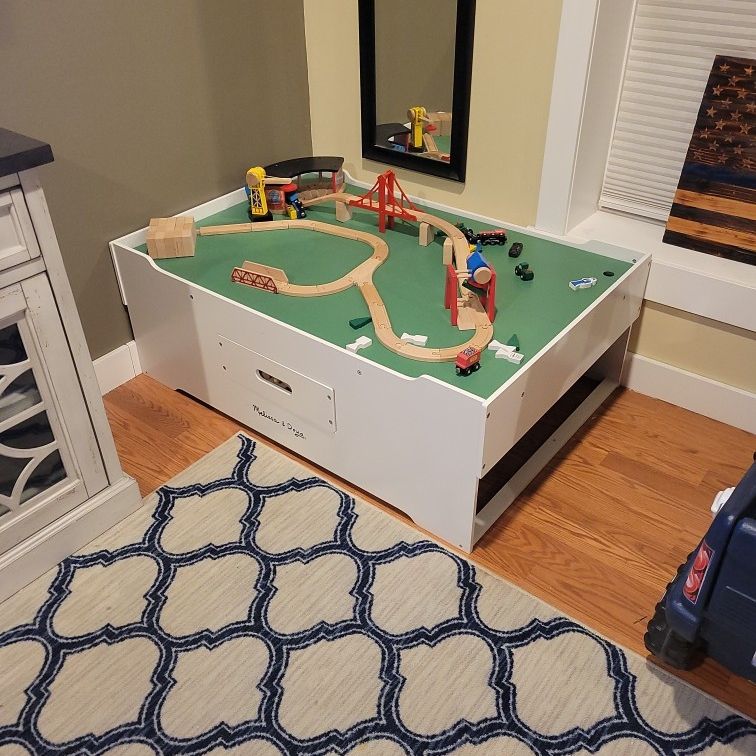 Table includes trains and tracks. Great condition.