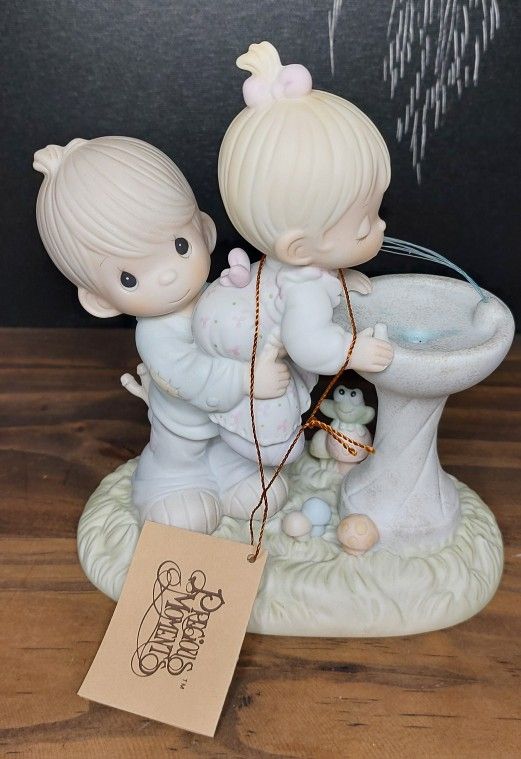 Vintage Precious Moments Large Figurine Your Love Is So Uplifting Boy & Girl At Water Fountain. So cute! New in box, box has shelf wear. **Estate Sale Find ** Cannot guarantee items coming from outside of my household to be pet or smoke-free but will note any smells that i personally smell. But everyones noses are different, and you may smell something I don't.
