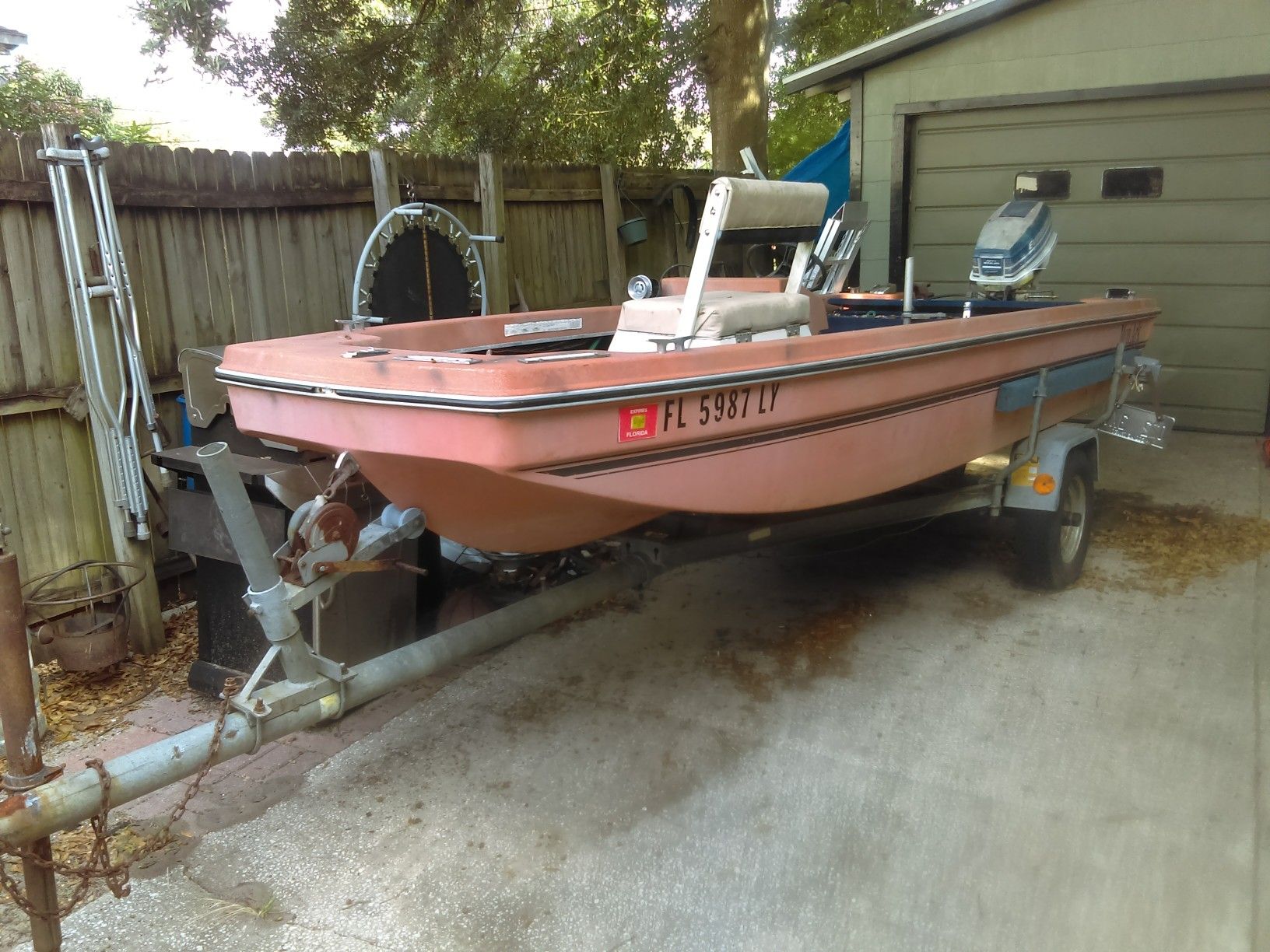 PROJECT boat.needs throttle control assembly with switch.50 horsepower sizzler evenrude motor.I have had it {url removed} pumps water.good compression.good tilt trailer,needs tires@ lights .tlc would make a great bass boat.carpet needs replaced. 15.5 feet long.two live wells.