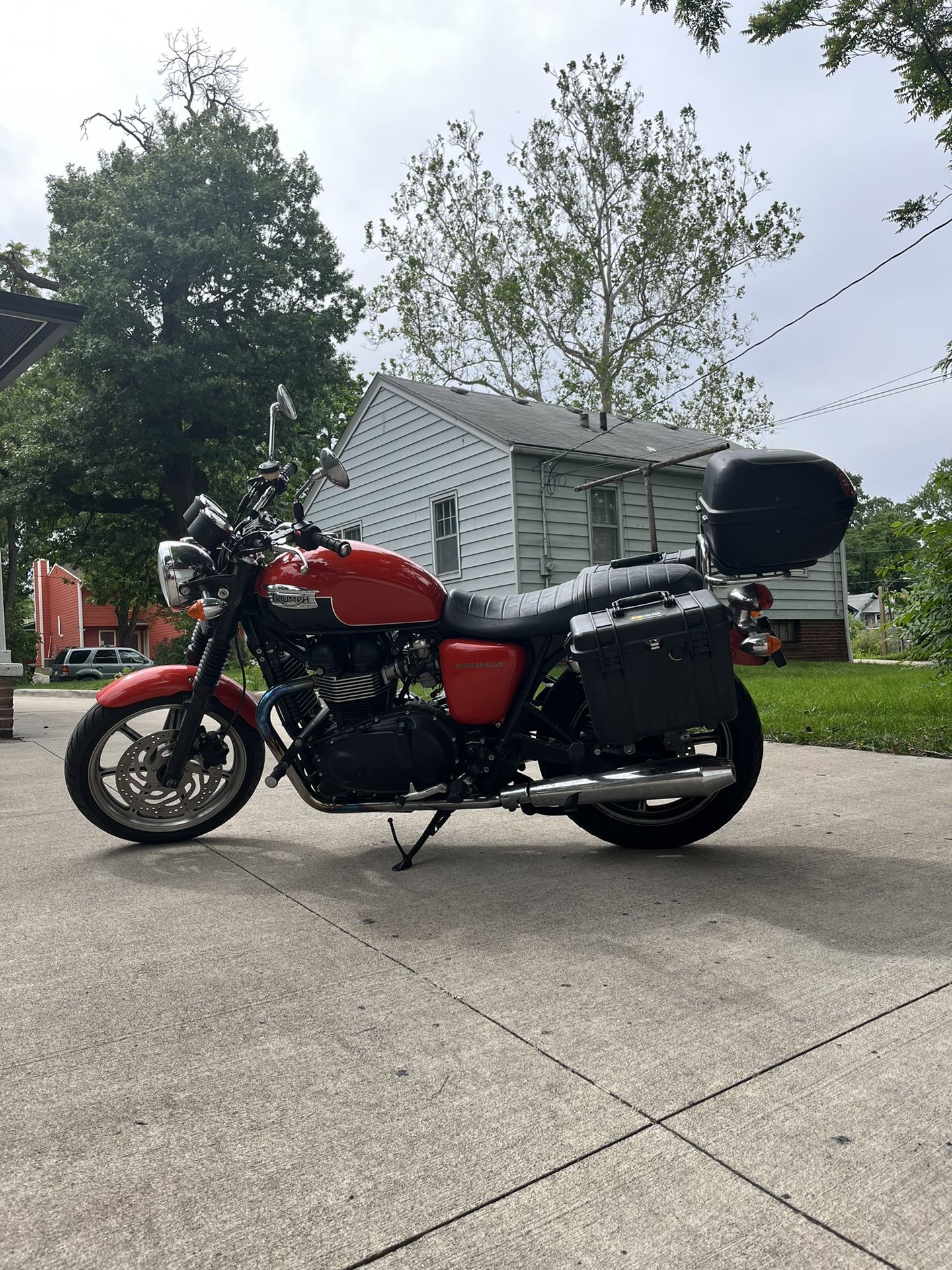 2013 Triumph Bonneville for sale. This bike has a bit under 28,000 miles and is in great condition. It includes an upgraded Triumph genuine tachometer/speedometer display (stock only has a speedometer), center stand, highway pegs, and skid plate. It also includes dual waterproof Pelican 1430 case saddlebags and a locking Givi top case. I also have a fly screen that fits the bike, I just removed it because I prefer the look without it. The bike has been well maintained and was checked out by the mechanic in the fall before winter storage. All is in good condition and it runs great now that it’s pulled back out. Cash only, cross posted. If interested, I can also include an XL helmet.