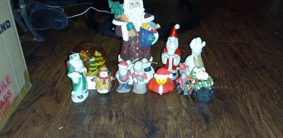 The collection includes various styles of Santa figures, likely made from materials such as ceramic, resin, or fabric. Items similar to these often date from the 1960s through the 1980s. Some figurines may represent different countries or feature specific details like a glass water globe base or a specific brand name. These items are typically used as Christmas decorations or kept as part of a collection.