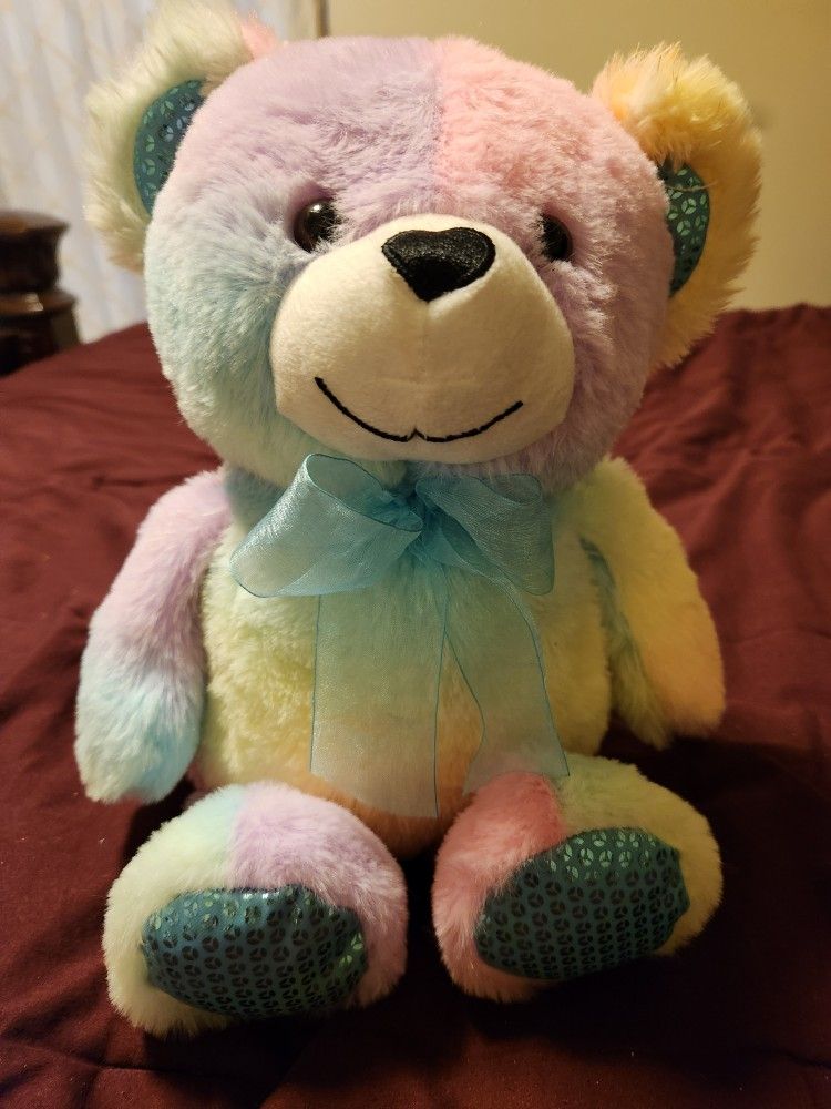 NWOT Teddy bear all in pastel rainbow colors. The bear has blue sparkly feet and ears to match. Also a blue bow tie and a heart shaped nose. 15"×12". Great for an Easter bear.