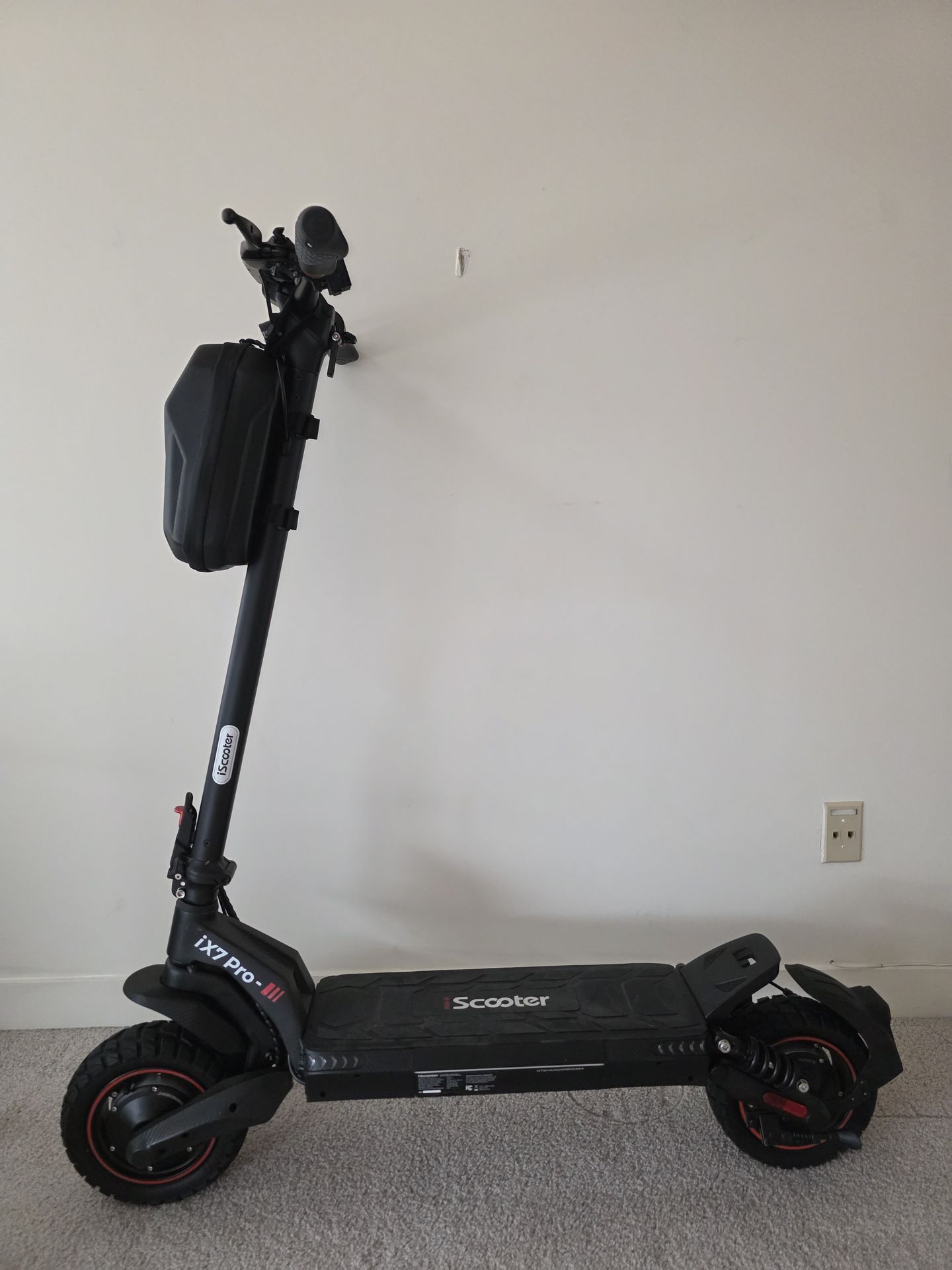 Almost like new iScooter iX7. Taken out of the box and used four times. All the lights work, charging port works, and no speed limit. I'll also give the waterproof bag that comes with a scooter lock.