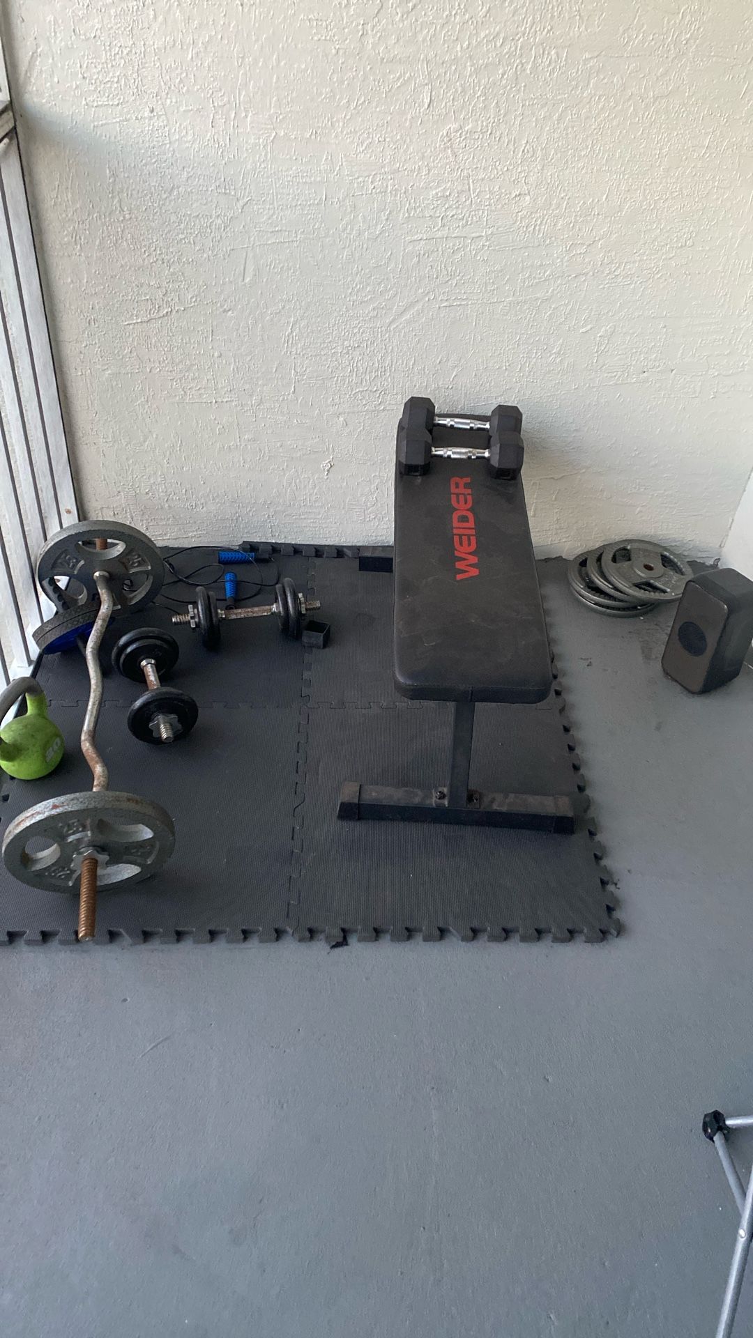 120$ for everything or message for individual items Curl bar with 25lb plates 20lb kettle bell 2x 10lb dumb bell 2x 25lb dumb bell Work out bench Ab roller 4x 10lb plates Work out mats