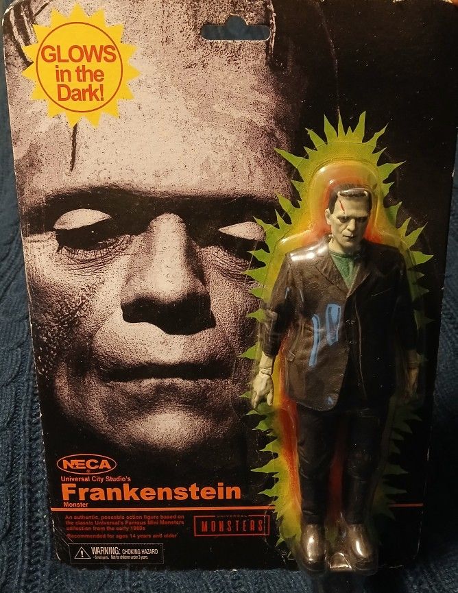 NECA Universal Monsters Retro Glow-in-the-Dark Frankenstein's Monster Figure is a 7-inch tall action figure that is poseable and glows in the dark. It is inspired by the 1980s Universal Famous Mini Monsters toy collection and is packaged on a classic tribute blister card.