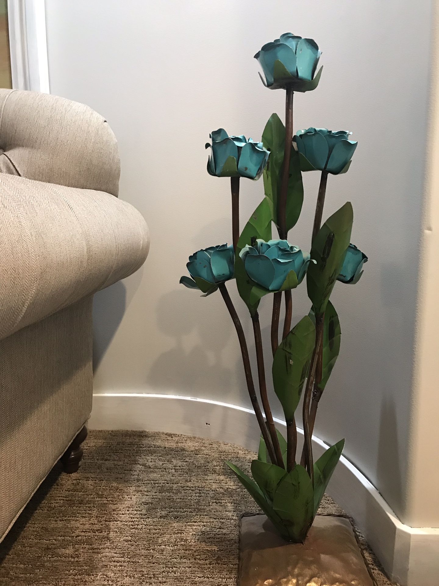 One of a kind wrought iron & steel metal turquoise sculpted rose garden