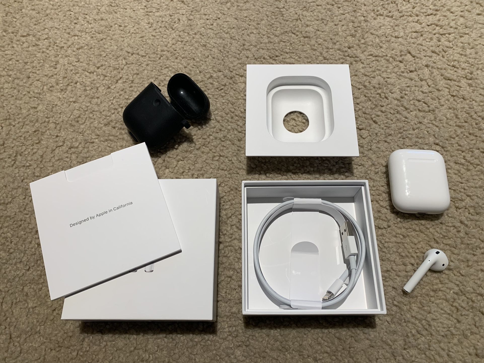 Comes with: - Charging Case - 1 AirPod - Charging Cable (never used) - Box - Papers - Black Silicon Protector