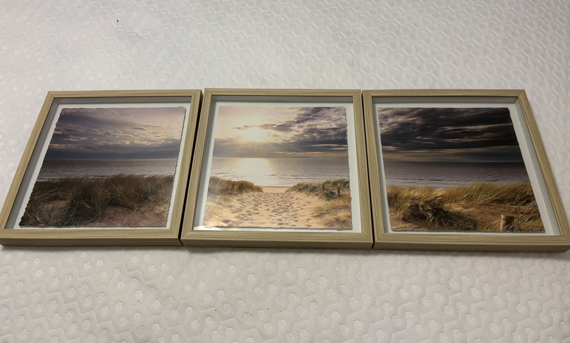 3 Beach Pictures Set. Hang them diagonal or straight, however you wish. Excellent condition. 11 x 11 inches each.