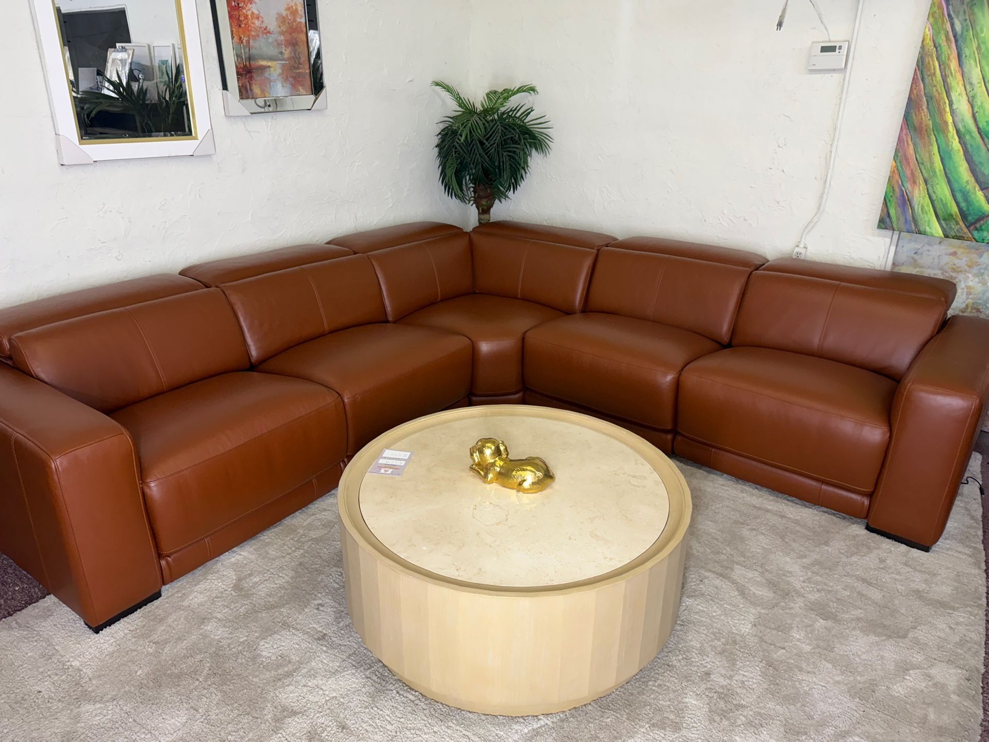 115"W x 115"D x 30"H Retail price: $8,045 It’s often hard to find a couch that has both sleek and compact shape with comfort. Those are not qualities easy to come across together. The Lexanna makes that merely a theory by offering a compact non bulky look with incredible comfort and support. The recliner is a huge plus as well. The dual recliners include the headrest that can fold up and down depending on your mood. The smooth quality real leather guarantees durability. This couch is a must have. Delivery available Financing available Store display item