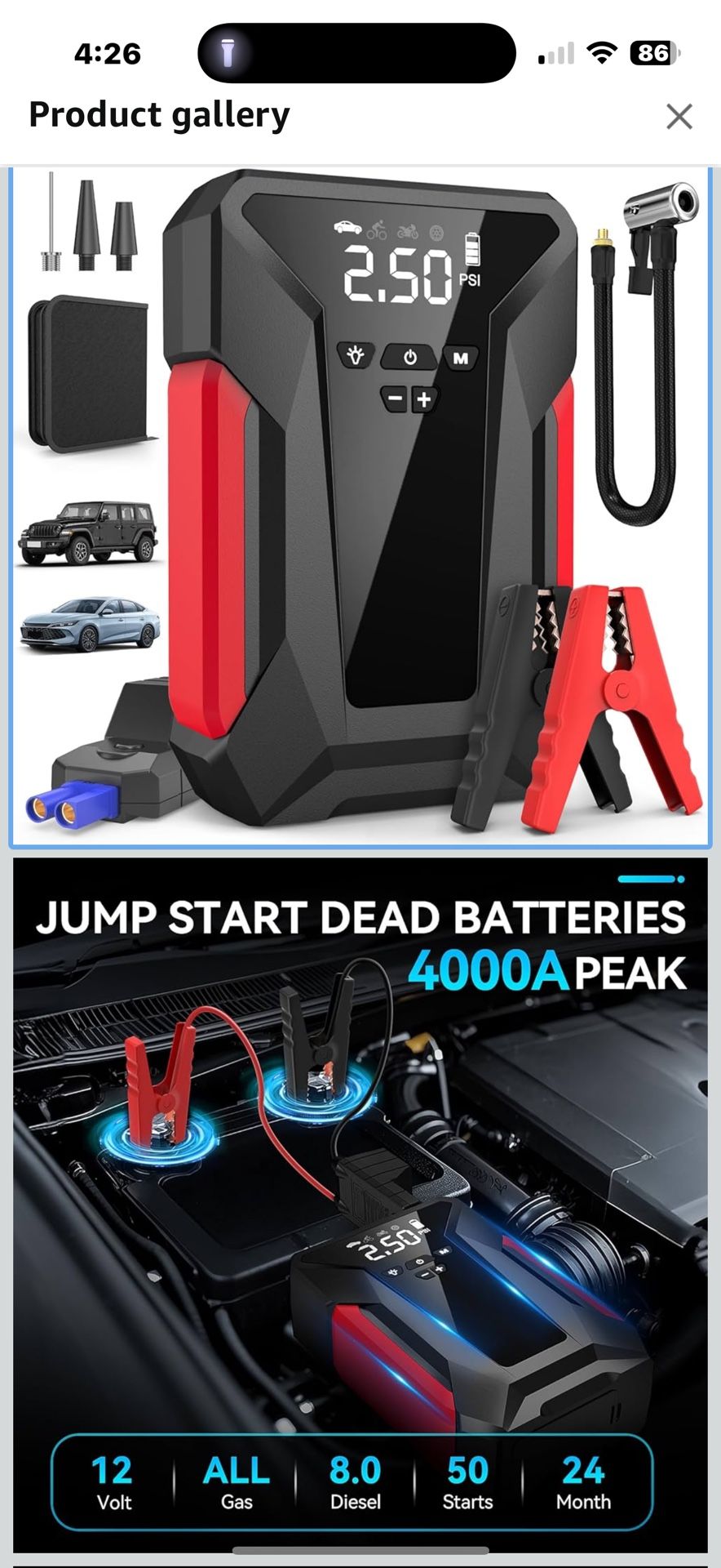 Jump Starter with Air Compressor,4000A Portable Car Battery Jump Starter (10L Gas/8.5L Diesel), 12V Battery Charger Booster,150PSI Auto-Shutoff Tire I