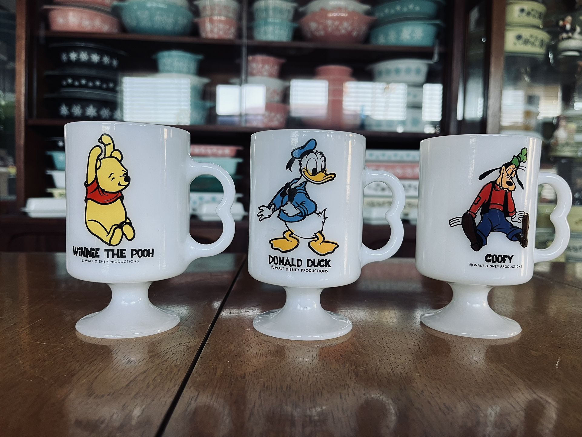 Winnie the poo Donald Duck Goofy Milk, glass coffee mugs Pedestal 3 pc 40$ 15$ for one